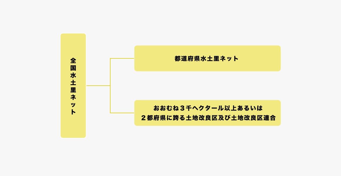 全国水土里ネットは、都道府県水土里ネット及び施行地域が2以上の都府県に跨り、またはおおむね3千ヘクタール以上の面積を有する土地改良区または土地改良区連合で組織されています。