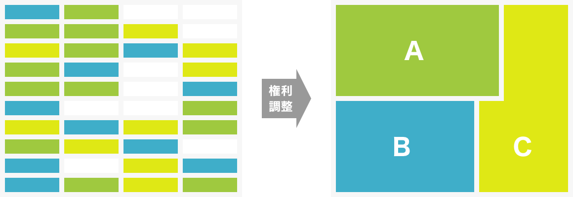 工事の実施により、農地が整形化されるだけでなく、より広い道水路が敷設され、農業の生産性の向上を図ることができます。しかし、形質が代わっても、その農地に関する登記情報は工事前のままであり、矛盾が生じてしまいます。そこで、工事前の土地と工事後の土地を同一なものとみなすための法的な手続(換地処分)を行うことにより、その矛盾を解消する必要があります。その際に、換地に係る権利調整機能を活用することで担い手への農地の集積・集約化を実現します。