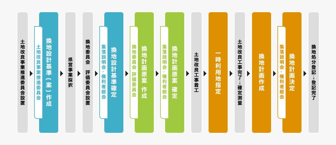 ほ場整備事業等、農地の区画形質の変更を伴う事業における、工事前の土地に対応して配分される工事後の土地のことを換地といいます。また、工事前の土地と工事後の土地を法律上同一なものとして、権利の帰属関係を一挙に解決する法律行為(換地処分といいます)のことを指す場合もあります。